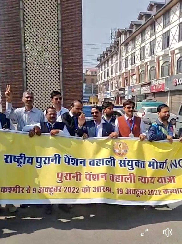 राष्ट्रीय पुरानी पेंशन बहाली संयुक्त मोर्चा के द्धारा ऐतिहासिक पुरानी पेंशन बहाली न्याय यात्रा आज कश्मीर से राष्ट्रीय अध्यक्ष बी पी सिंह रावत राष्ट्रीय महासचिव वीरेंद्र दुबे के नेतृत्व में बड़े जोश के साथ आरंभ हो गई है इस यात्रा को लेकर कश्मीर से लेकर कन्याकुमारी तक सभी एनपीएस कार्मिकों में उत्साह है जोश है