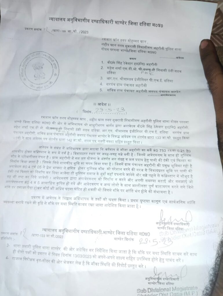 ग्राम अहरौनी के शासकीय सर्वे क्रमांक 753 रकवा 0.21 हे. भूमि जो कब्रिस्तान हेतु भू राजस्व रिकॉर्ड में कई वर्षों से दर्ज है। जिस पर ग्राम पंचायत के समस्त पदाधिकारियों सरपंच ,सचिव ,ठेकेदार, एसडीओ आदि के द्वारा शक्ति के बल पर अतिक्रमण करते हुए बोरिंग कर दी गई है एवं टंकी निर्माण कार्य किया जा रहा है ।उक्त निर्माण कार्य पर अनुविभागीय अधिकारी भांडेर द्वारा स्थगन आदेश पारित किए जाने के पश्चात भी टंकी निर्माण कार्य नहीं रोका गया है ।उल्लेखनीय है कि ग्राम पंचायत अहरौनी में टंकी निर्माण हेतु और भी अन्य स्थानों पर करीब 70 बीघा शासकीय भूमि उपलब्ध है किंतु फिर भी पदाधिकारियों द्वारा कब्रों को खोदकर कब्रिस्तान पर टंकी का निर्माण कार्य किया जा रहा है।